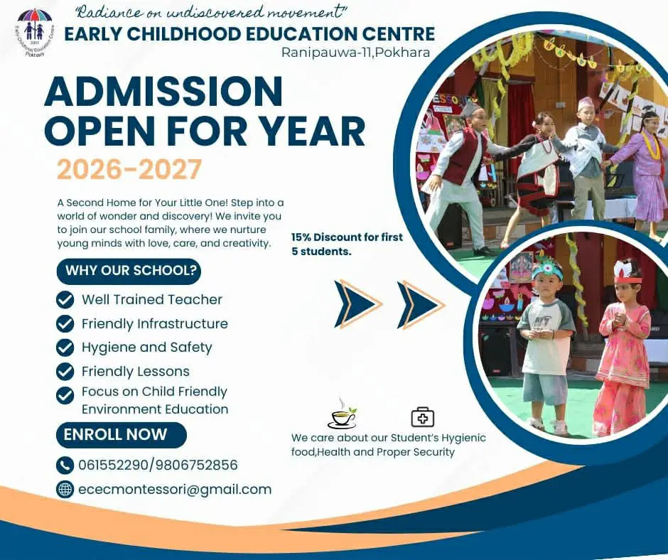 ECEC also known as Early Childhood Education Centre was established in February 2005 in Pokhara, Ranipauwa-11, Tulsimarga to give our best education to children from age group infant to 11 years. It’s not that only a place where they spend almost half of the working hours believing that every child should have the right and privilege to adequate and child centered education in safe and peace environment.